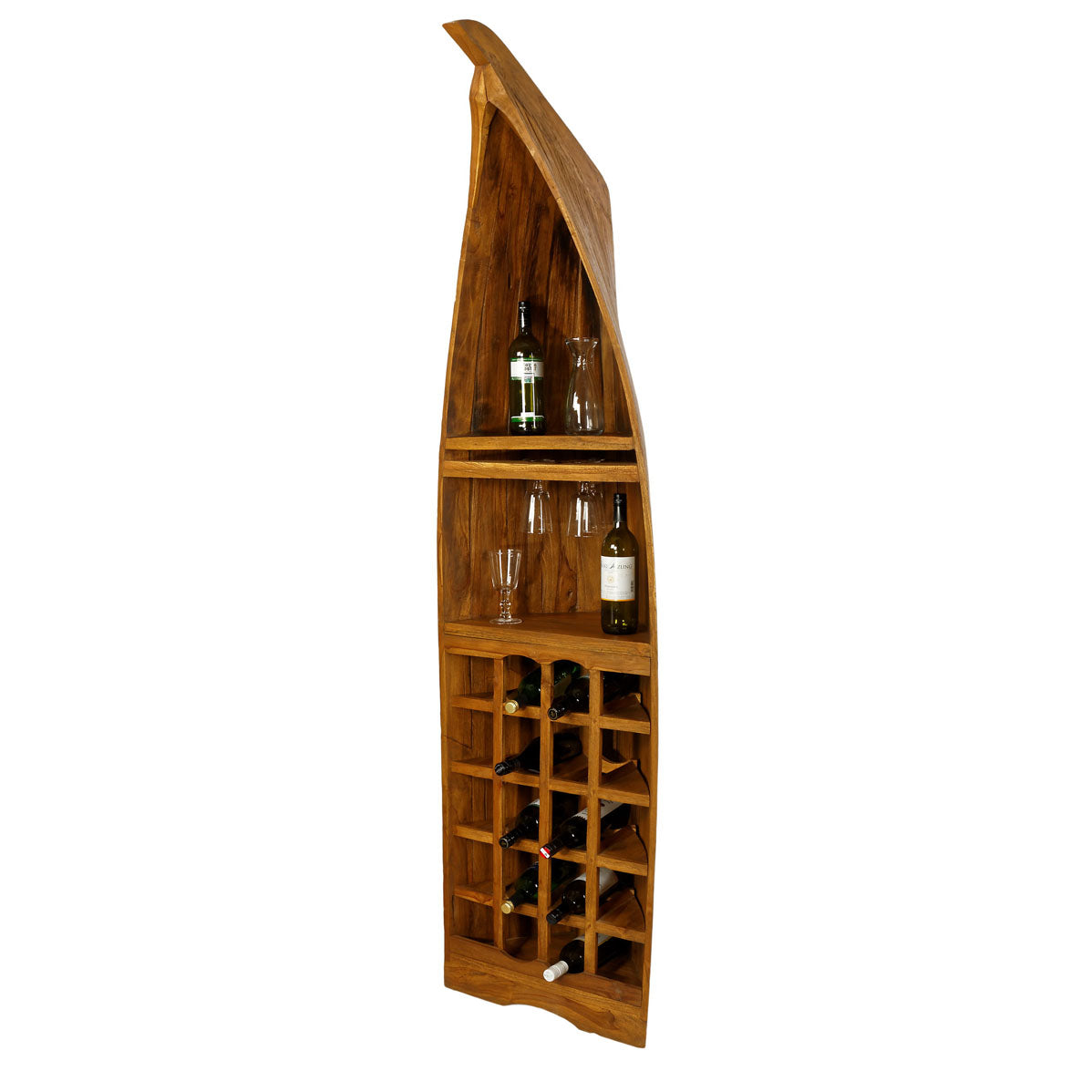 Dank der geräumigen Ablagen und clever integrierten Fächer ist dieses Regal nicht nur ideal, um Weinflaschen stilvoll zu präsentieren, sondern bietet auch Platz für Gläser, Zubehör und alles, was eine gut sortierte Bootsbar braucht. Egal, ob Sie es im Wohnzimmer, der Küche oder Ihrer heimischen Bar einsetzen: Mit diesem einzigartigen Möbelstück segeln Sie immer auf der Erfolgswelle.