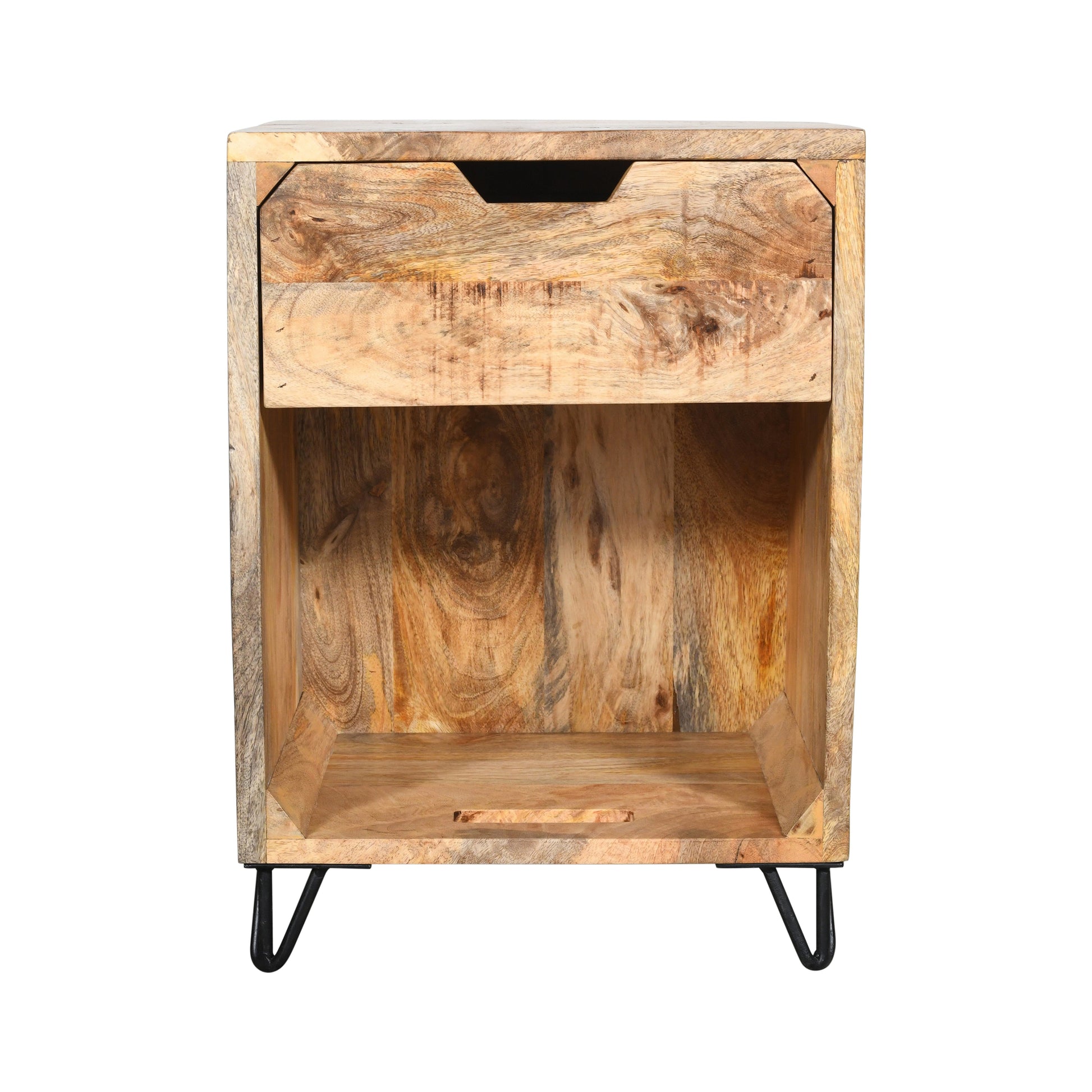 Suchst du einen Nachtschrank, der deinen Morgenkaffee, dein Lieblingsbuch und deine Geheimnisse stilvoll aufbewahrt? Unser Nachttisch Box aus Mangoholz mit einer Schublade und coolen Metallfüßen ist die perfekte Wahl!