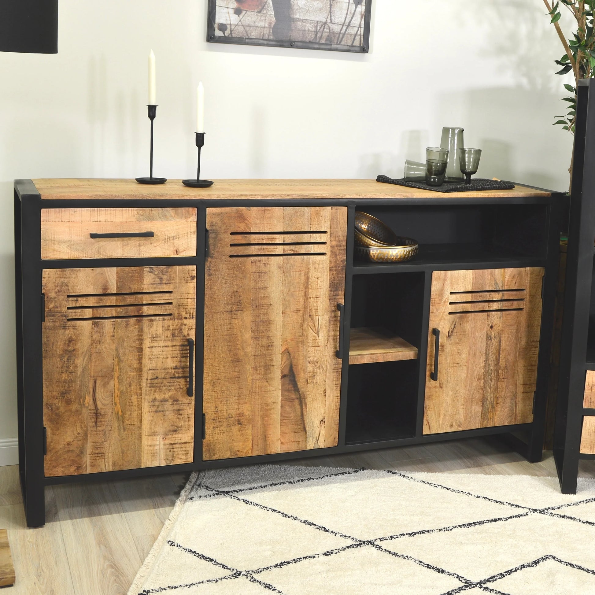 Das warme Mangoholz trifft auf kühles Metall und sorgt so für einen industriellen Look, der jeden Raum aufwertet. Die zwei Türen sind ideal, um den kleinen Alltagskram diskret verschwinden zu lassen (man muss ja nicht alles zeigen, oder?), während die Schublade bereit steht für die Dinge, die Sie immer griffbereit haben wollen. Und der offene Regalboden? Perfekt für Ihre Lieblingsdeko oder ein paar gut platzierte Bücher.