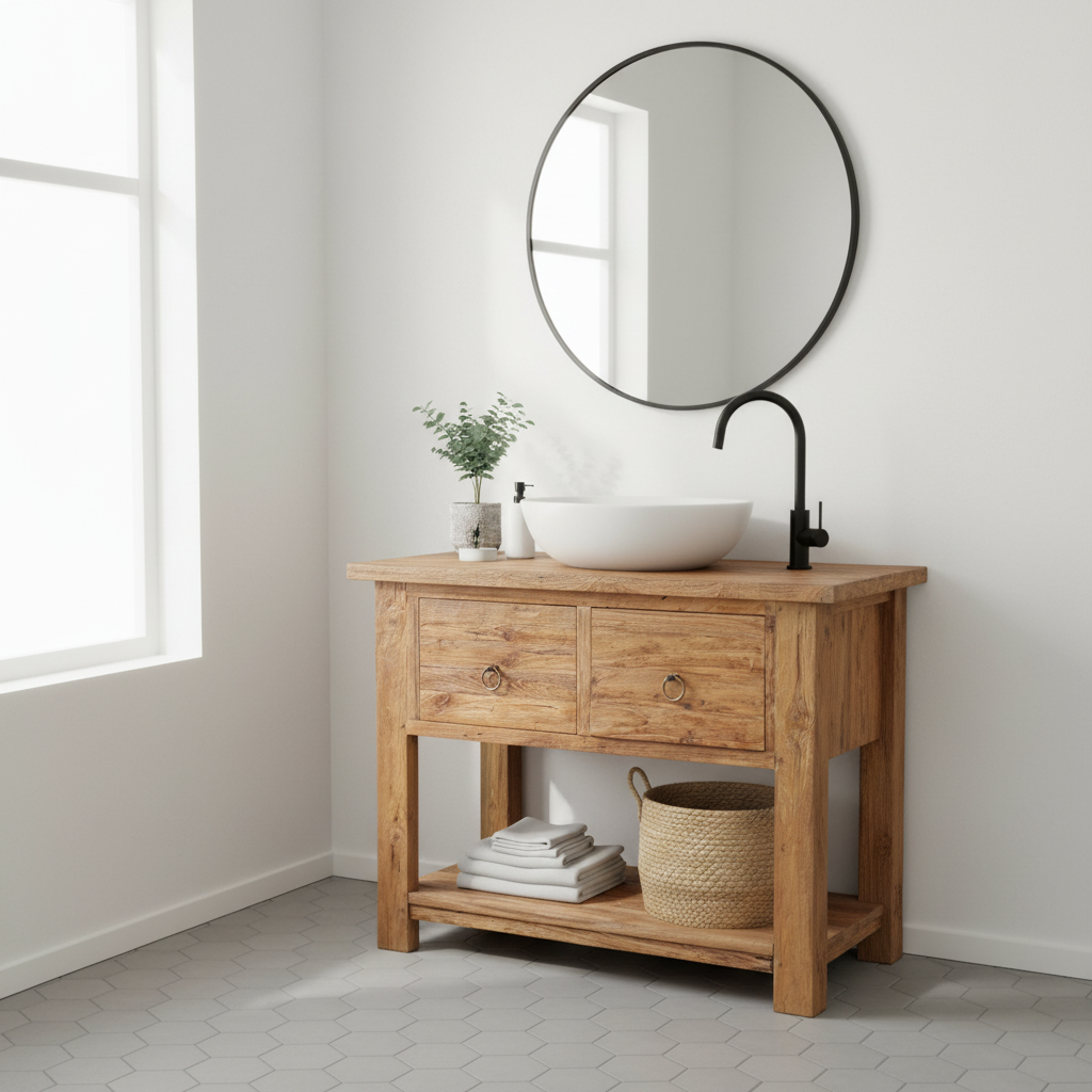Hochwertiger Waschtisch mit zwei Schubladen aus recyceltem Teakholz